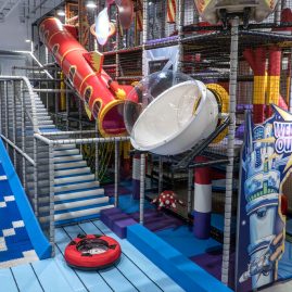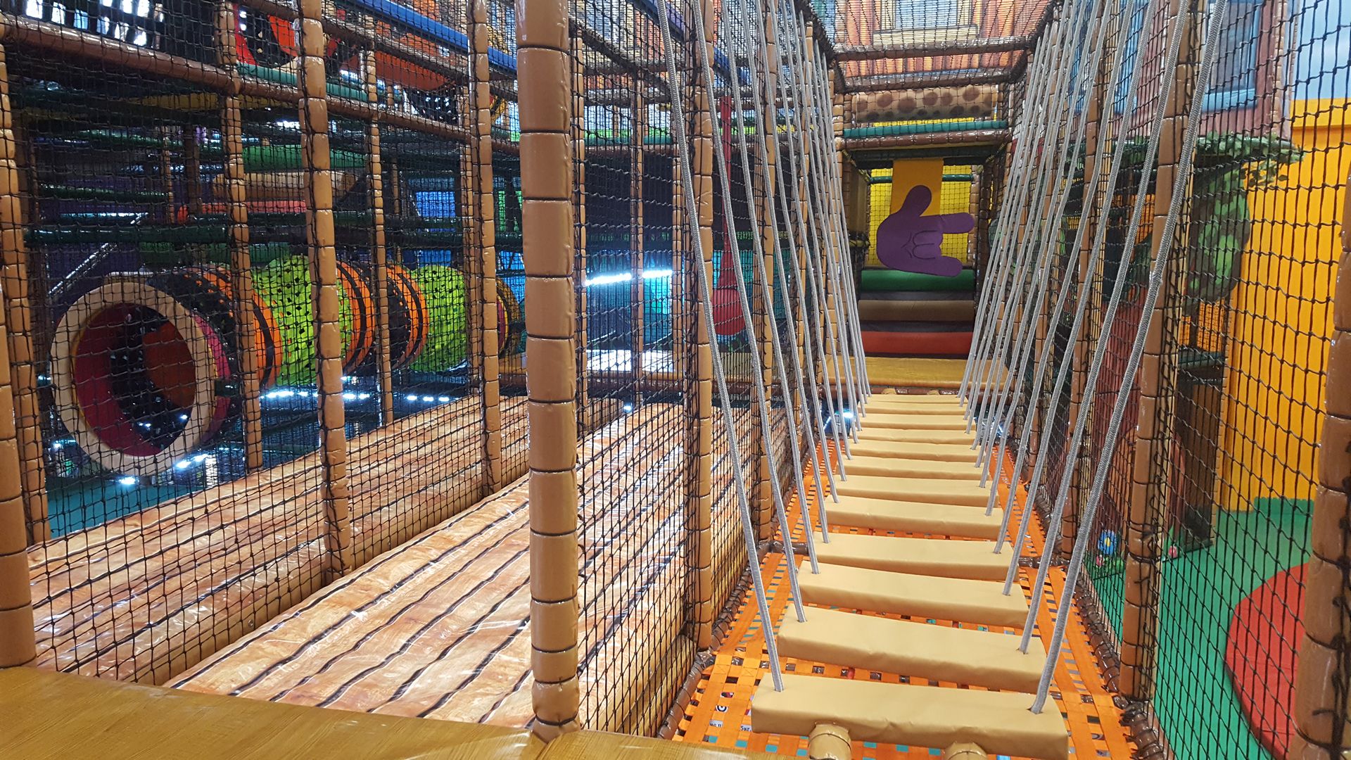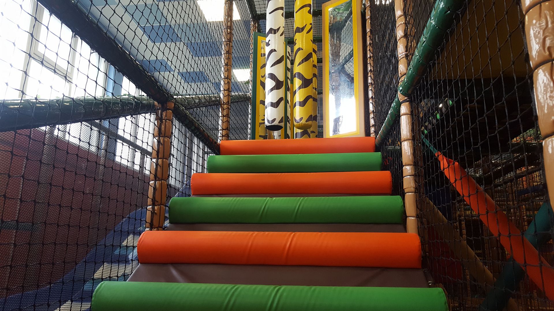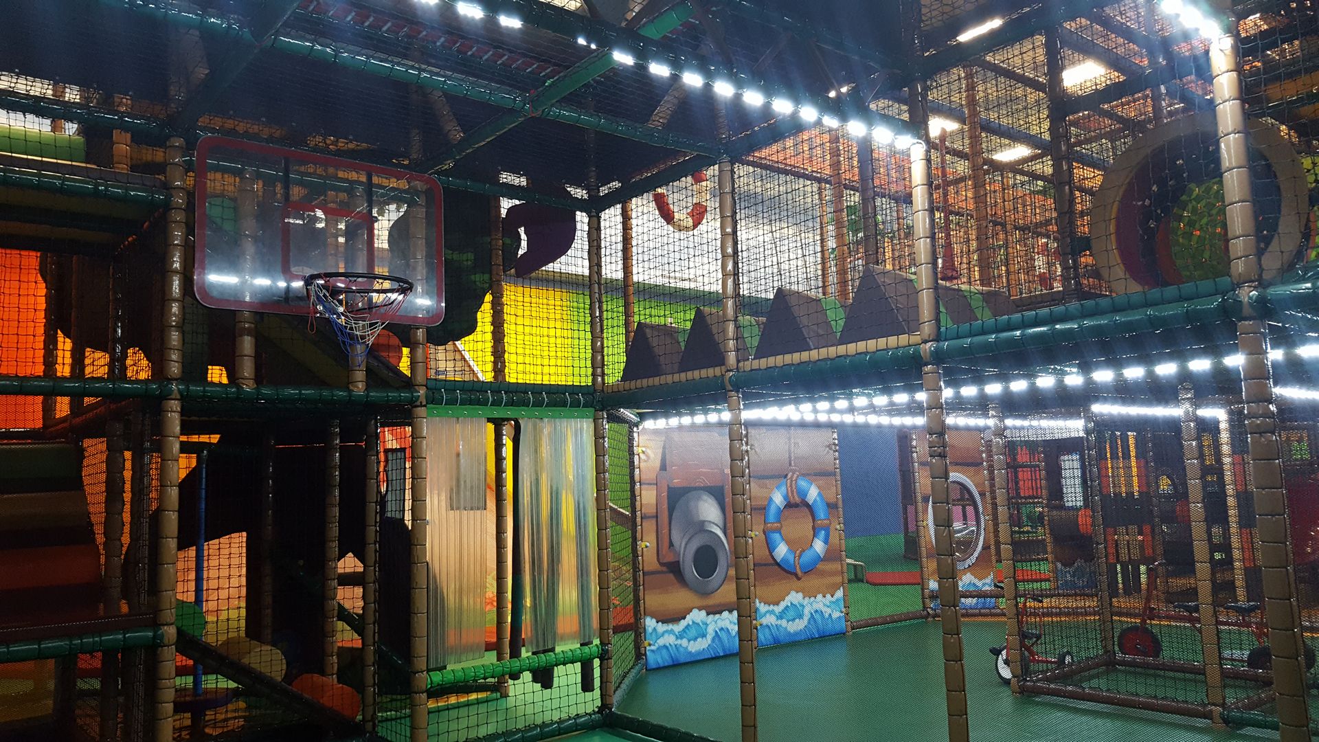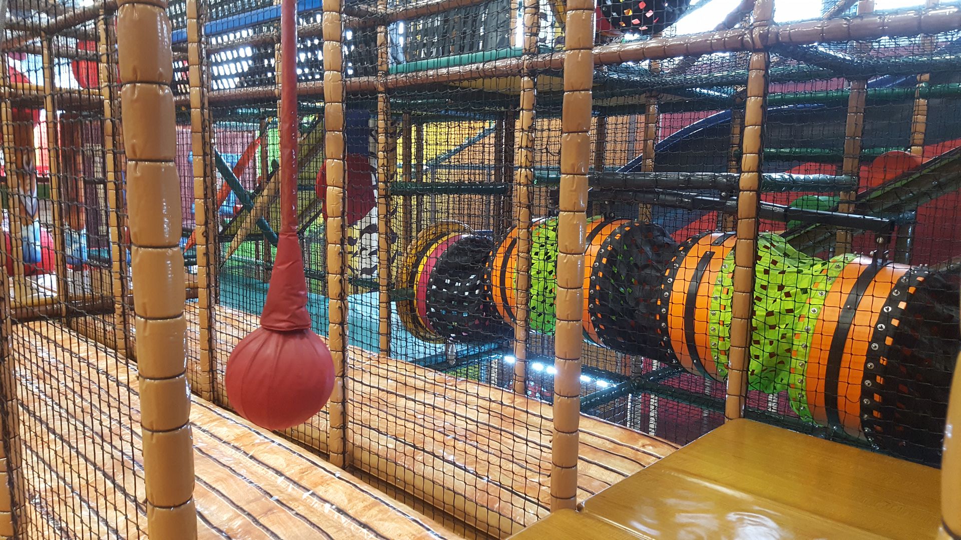 Nabrojaćemo samo neke od atrakcije u glavnom delu igru. U lavirintu se nalazi veliki crveni spiralni tobogan. Kreće sa trećeg nivoa i završava na prvom. Tri spiralna namotaja, sasvim su dovoljna da se malo zavrti u glavi, ali ne previše. Na drugom kraju lavirinta nalazi se četvorostruki talasasti plavi tobogan. Spust kreće sa 7m i pravi je doživljaj. Te četiri staze pravo su mesto i za takmičenje. Ko će prvi stići na cilj i preći put od 15 metara. Tik uz plavi tobogan nalaze se dve tramboline. Oni koji znaju, na njima mogu da izvedu i salto, jer one zaista odskaču. Tu su i dva zip lajna, avantura mostić...